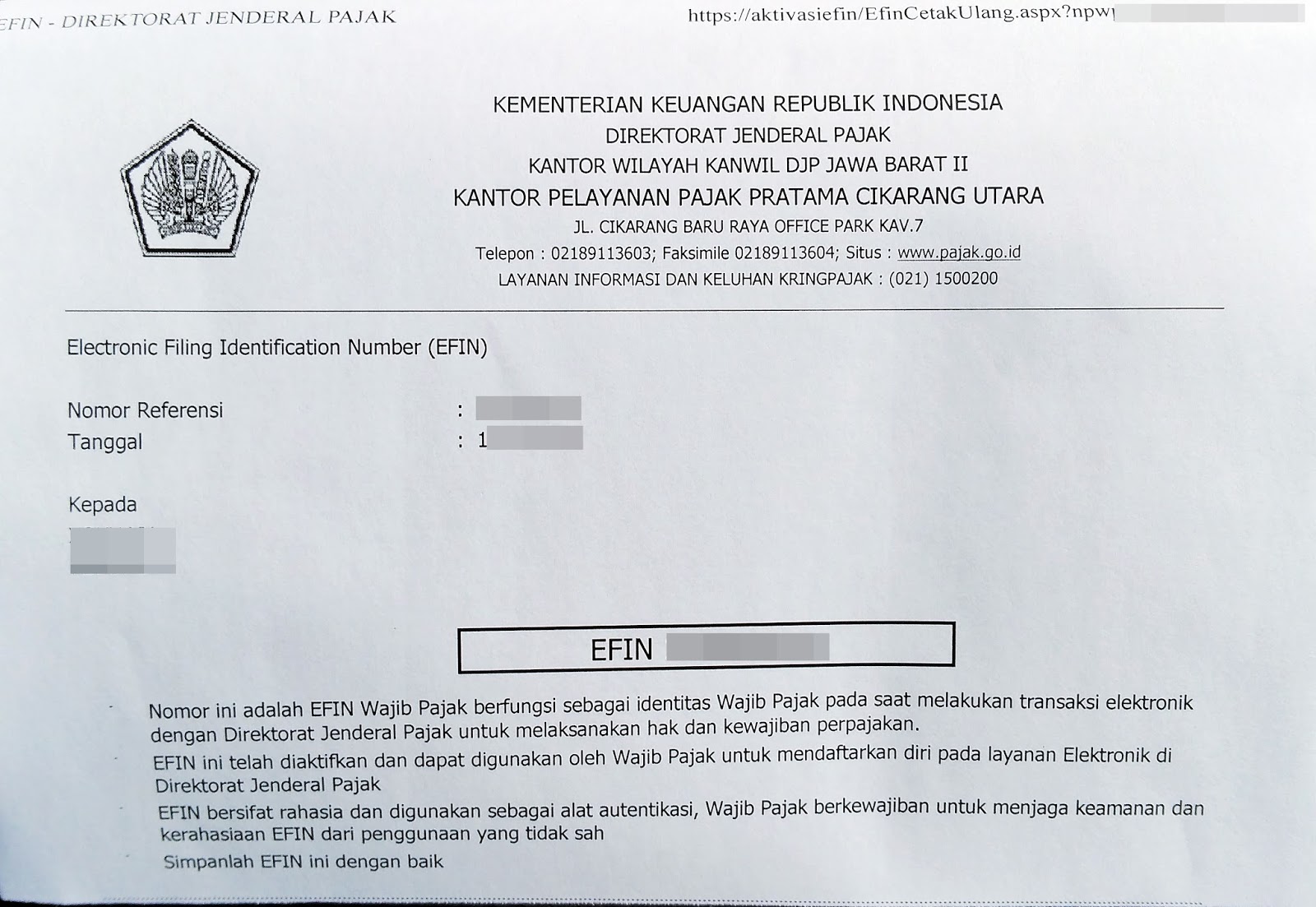 Latest updates and statistic charts. Jalan Gatot Subroto, Kav. 40-42, Jakarta 12190 Telp: (+62) 21 - 525 0208 Untuk mengaktivasi EFIN, Anda dapat mengikuti prosedur sebagai berikut: 1. Permohonan aktivasi EFIN dikirimkan ke surel resmi kantor pajak terdaftar berisi data Proof of Record Ownership (PORO) dan formulir permohonan EFIN. 2. Data untuk verifikasi PORO wajib pajak Orang Pribadi: a. NPWP; b. Nama; c. NIK; d. Alamat terdaftar; e. Alamat email; dan
