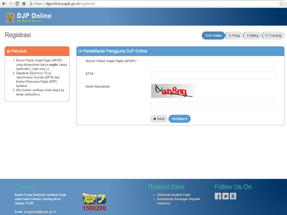 e-Registration atau Sistem Pendaftaran Wajib Pajak secara Online adalah sistem aplikasi yang merupakan bagian dari Sistem Informasi Perpajakan di lingkungan Direktorat Jenderal Pajak untuk mengelola proses pendaftaran Wajib Pajak. Cara mendaftar NPWP Online. Saat ini, mendaftar untuk NPWP online hanya dapat dilakukan melalui situs web DJP. Anda dapat langsung membuka https: /ereg.pajak.go.id. Untuk mendaftarkan akun baru, jika Anda belum membuat akun. Masukkan Alamat Email Anda (email yang aktif dan sering digunakan) Lalu, ketik Captcha.